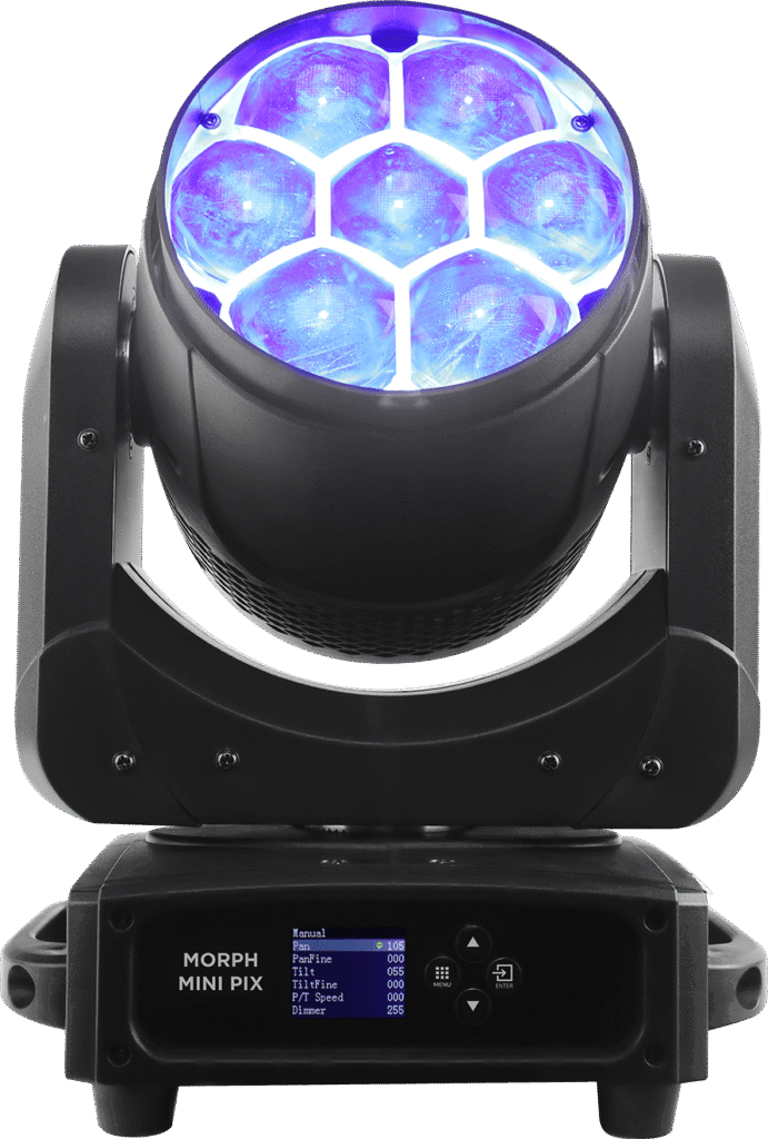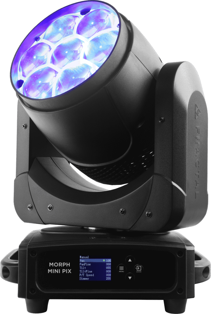 Fractal Lights Morph Mini Pix is a small, agile Wash fixture with high power, standing out not only for its wide zoom range but also for its additional moving front lens. By combining these features, the Morph Mini Pix becomes a versatile lighting tool, ideal for both stage and decorative effects.