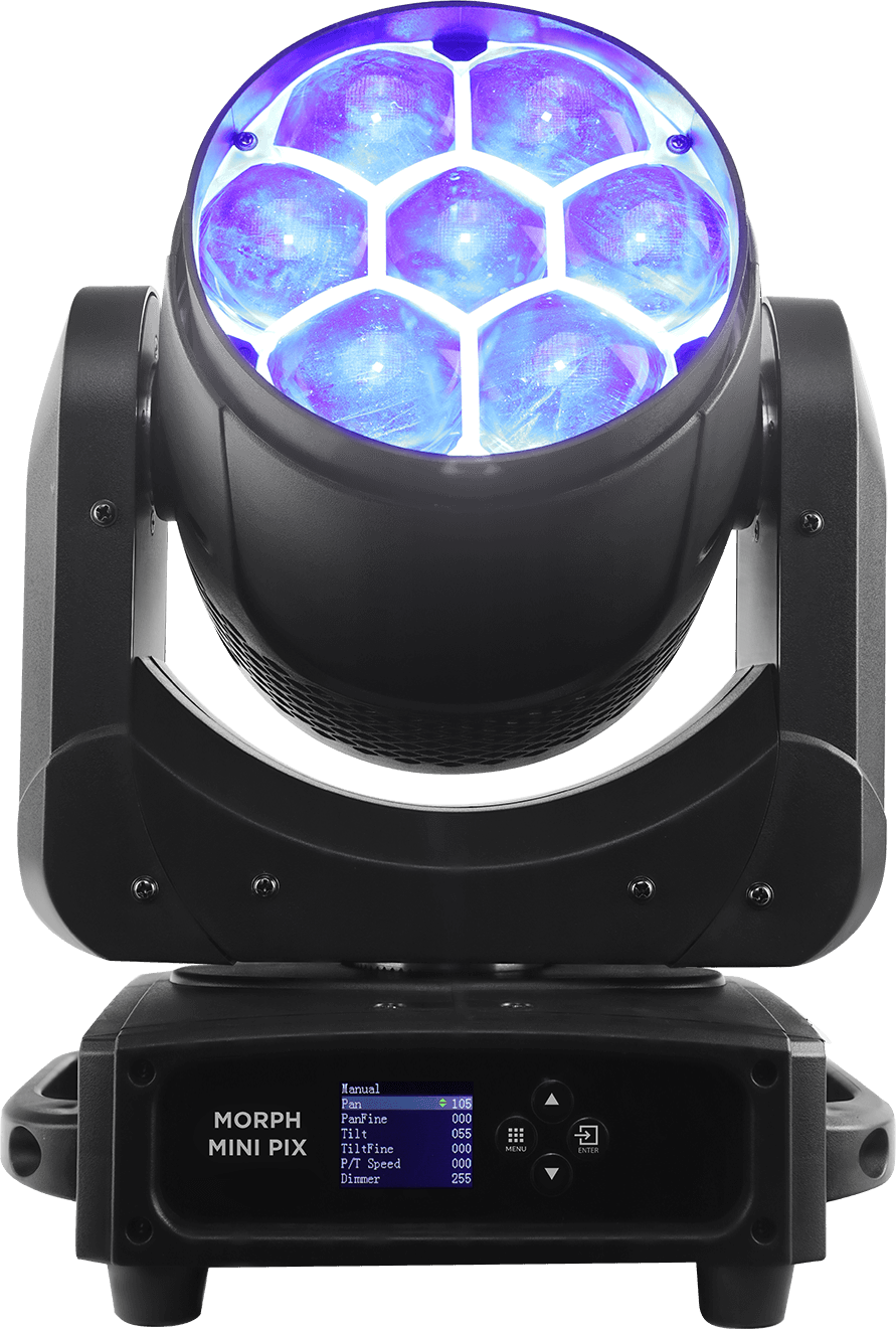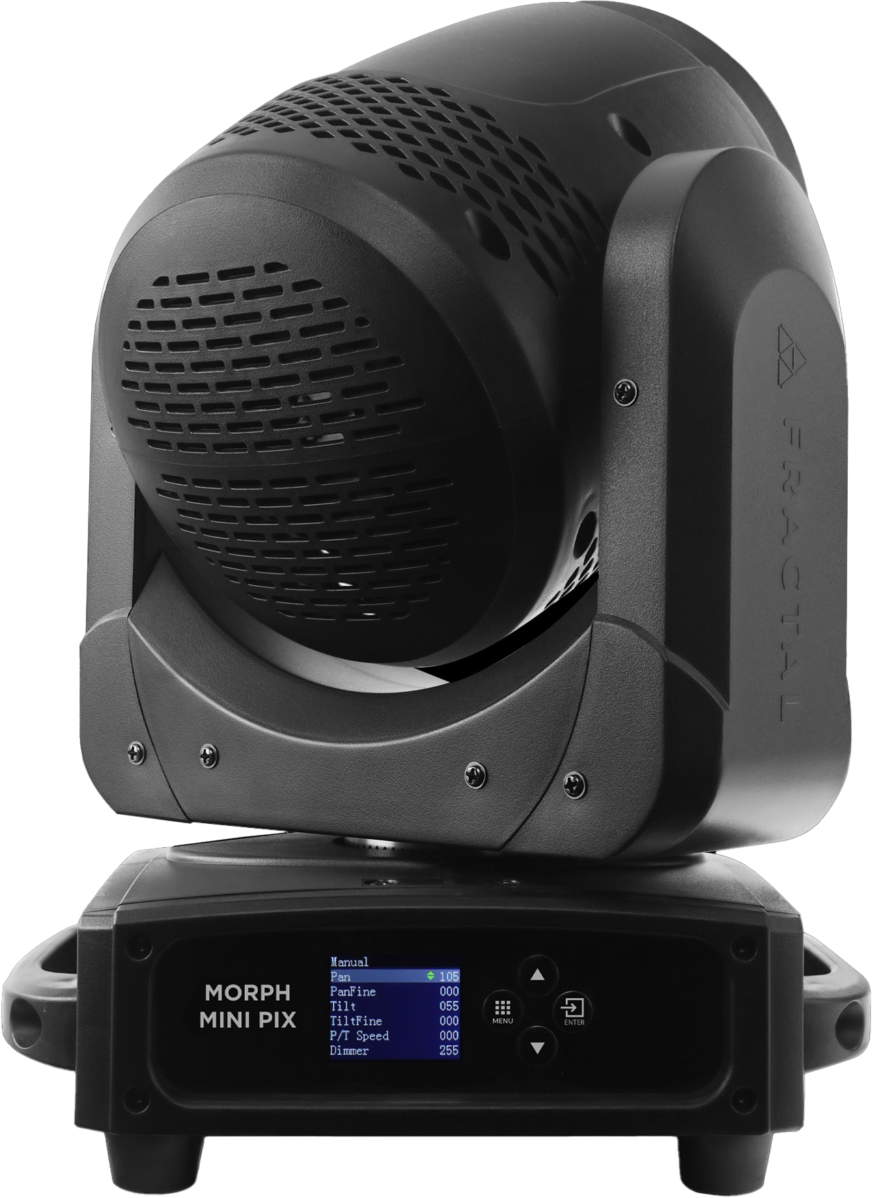 Fractal Lights Morph Mini Pix is a small, agile Wash fixture with high power, standing out not only for its wide zoom range but also for its additional moving front lens. By combining these features, the Morph Mini Pix becomes a versatile lighting tool, ideal for both stage and decorative effects.