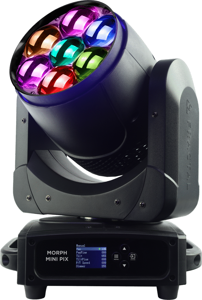 Morph Mini wyposażony jest w siedem diod LED o mocy 40 W każda, co daje w efekcie wyjątkowo mocne i jasne oświetlenie. Przy jasności sięgającej 16,000 luksów z odległości 5 metrów, ten Wash oferuje wydajność, której można oczekiwać od znacznie większych gabarytowo urządzeń. Zachowuje przy tym niską wagę (6 kg), co świetnie sprawdza się w przypadku mobilnych instalacji.
